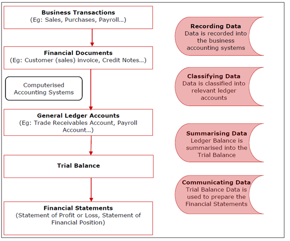 The process starts with recording all business transactions with information available in the financial documents and classifying them into the relevant ledger accounts through computerised systems or journals. At year-end, balances of each ledger account form the trial balance, which is used as a basis to prepare the financial statements.