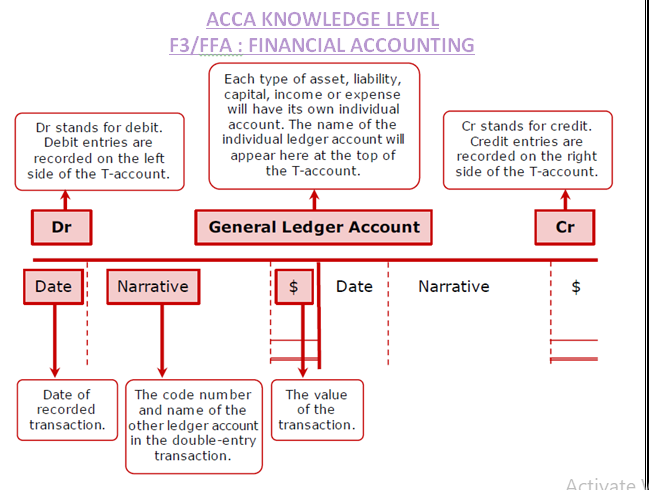 The individual ledger accounts within the general ledger are called T-accounts, as they form the shape of a ‘T’, as shown below: